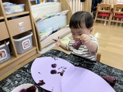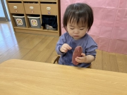 後日さつまいもスタンプをすると、模様が付くことが楽しかったようで、何度もペッタンペッタンとスタンプしたり、できた模様を触って楽しんでいました。