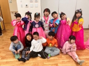 年長クラスのうちゅう組さんは、韓国の伝統衣装であるチョゴリを着てファッションショーのように歩きました。見ていたお友だちからは「かわいい〜!」と歓声があがっていました。うちゅう組さんはきりっとした表情で緊張しながらも堂々と歩いていました。