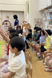 - 本日、幼児クラスでは七夕集会を行いました。 由来の話をパネルシアターでじっくりと観てから、七夕にまつわるクイズでは、子ども達が物語を思い出しながら「神様が許してくれた!」「?だと思う!」と笑顔いっぱいに答えていました。