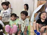 - 今日は園長先生のお話会がありました。少し部屋を暗くして、ロウソク(のおもちゃ)を灯して、いつもと違う雰囲気の中で季節の絵本や手遊び、わらべうたをみんなで楽しみました。絵本を通して「夏」という季節の訪れを感じたり、ちょうど育てているトウモロコシのお話に興味を持ったりする姿が見られました。また次回も心待ちにしている子ども達です!