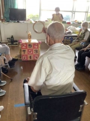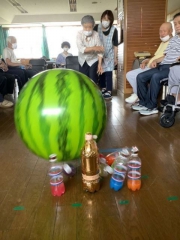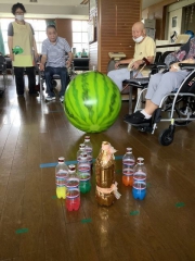 - 6月最後の日曜日。この日の午後は設備点検の為に2時間ほど停電でした。普段はカラオケなどを楽しむ時間でしたが、カラオケの機械が停電により使えない為、日曜日メンバーで輪投げ&ボーリング大会を行いました。