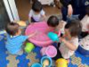 梅雨も明け、暑い日が続く毎日ですが、保育園では、気温や子ども達の様子に合わせて水遊びや感触遊びを楽しめるようにしています。7月当初は、タライの中に入っている水や氷に触れた時に、戸惑う姿や冷たい感触に驚く姿がありましたが、安心できる保育士が子ども一人一人に寄り添い、気持ちを汲み取って共感しながら関わることによって少しずつ慣れていきました。今では保育士がテラスで水遊びなどの準備をしていると、保育室からじっと様子を見て、楽しみに待っている姿があります。準備が整い、テラスに出ると、それぞれが好きなように遊び始める姿があるので、「冷たくて気持ちいいね」「お水だよ〜ジャ〜♪」など、言葉かけを大切にしながら一人一人がゆったりと水遊びを楽しむことができるように関わっています。