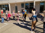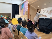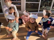幼児クラスでは、豆まきをする前に節分に関するパネルシアターを見て節分の由来について伝えると、「お腹にいる悪いものを追い出すんでしょ」「恵方巻を食べるよね」と自分が知っていることを話したり、真剣な表情で話を聞いたりしていました。園庭に出ると、「鬼さんには負けないよ」と話す子どもの姿もあり、「エイエイオー!」と掛け声をしてから豆まきをしました。「おにはーそと!」と元気な声を出しながら一生懸命に鬼に向かって豆を投げていました。鬼が逃げていく様子を見て、「鬼いなくなったよ!」と満足感や達成感を味わっていた子ども達でした。