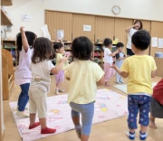 2歳児クラスでは英語の先生が来ると、誰だろう?と不思議そうな顔をしていましたが、先生の『ハロー』の挨拶に、ワクワクした様子がみられました。音楽に合わせて手遊びをしたり、英語の歌で“幸せなら手をたたこう”に合わせ、手拍子や足を踏み鳴らし、楽しんでいました。
