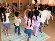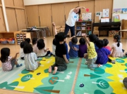 3歳児クラス〜5歳児クラスでは音楽に合わせて、アルファベットを体で表現する遊びをしました。 “G”のポーズが一番の人気で大盛り上がり!先生に褒めてもらうと、『イエーイ!』と喜んでいました。そして、鳴き声動物クイズもあり、『ひつじ!』、『にわとり!』と子ども達が答え、英語での鳴き声と動物の名前も教えてもらい、先生と一緒に復唱して楽しんでいました。