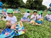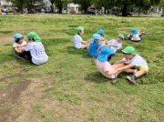 まずは、芝生広場でみんなでリズムをしました。広い芝生をのびのびと使い、音楽に合わせて全身を使って遊びました。異年齢児との関わりも楽しめるよう、クラスをまたいだペアでの動きも、互いに笑顔を見せながら楽しんでいましたよ。