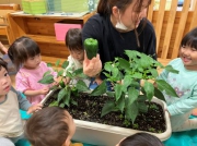 そして、ピーマンが大きく育ったので収穫しました。ピーマンに触れてみたり、匂いを嗅いで興味津々。調理してもらい給食で食べました。