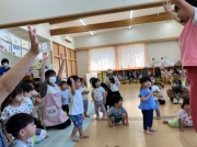 地域の方と0・1歳児クラスでは、最初は保育士の側で静かにしていた子ども達でしたが、明美先生の明るく優しい声掛けや様々な動きの誘い掛けに、興味を持って明美先生に近寄っていく子ども達。最後の「ピカピカブー」では、にこにこと楽しそうに保育士や保護者と一緒に伸び伸びと体を動かしていました。