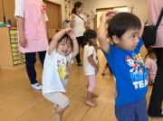2・3歳児でクラスでは、最初に手を開いて横に手を振ったりと様々な動きをした後、その動きが入った体操の音楽がかかると、元気いっぱいで踊っていました。汽車になりきる動きでは、自由に部屋の中を動き回ってみたり、保育士の足のトンネルを通る時には、どの保育士のトンネルでもたくさんの笑顔がみられていました。