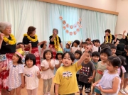 今月のお楽しみは、昨年に引き続き、地域の方に来ていただいて、フラダンスを披露してもらいました!昨年見ていた子ども達は、「みたことある!」、初めての子ども達も、「何が始まるんだろう!」とワクワクした様子が見られました!音楽が聞こえてくると、真剣に見つめたり、動きを真似してみたりと様々な楽しみ方をする子ども達です!地域の方から動きの意味を教えてもらい、最後はみんなで『みんなアロハ』という曲に合わせてみんなでフラダンスをする事に!地域の方と一緒にフラダンスをする事を喜んでいました♪