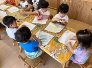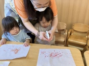 続いて取り組んだのは、マーカーを使った「にじみ絵あそび」です。 保育士が色の混ざり方を目の前で見せると、「わぁ、なんだろう?」と不思議そうに見つめる子ども達。マーカーを手にすると、自由に描くことに夢中になり、水と色が混ざり合って紙に広がっていく様子に、興味をしめしていました。