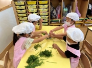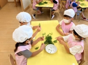 収穫した人参は、実も葉っぱも余すことなく使い、みんなで「人参ふりかけ」を作りました。葉っぱを細かくちぎって炒め、かつお節やゴマを加えて、香ばしくて栄養たっぷりのふりかけが完成!子どもたちは「おいしい!」と笑顔いっぱいで味見していました。自分たちで育てた野菜を調理して食べる体験は、食への関心や感謝の気持ちを育む貴重な時間となりました。