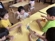 中でも特に子ども達が興味を持ったのが身近にあまり見る機会のない“藁”でした。そこで、本物の藁を使って表現遊びの背景を子ども達と作ったり、藁を使った製作を行いました!藁に触れていくうちに、香りや感触に気付き始めるばら組の子ども達。そのうち、自由遊びの中でも子ども達同士で3びきのこぶたごっこをするほど、子ども達の中で「3びきのこぶた」が身近なものになっていきました。こうした本物に触れる経験が子ども達の遊びや生活を豊かにしています!