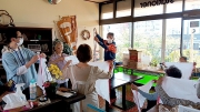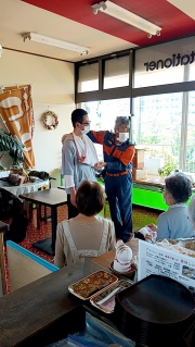 アルファ米を使用したわかめご飯を提供する事となり、アルファ米の紹介、作り方について実演を交えながら行いました。わかめご飯が出来るまでの間は、地域で消防団として活躍されている住民の方を講師に招き、三角巾を使用した止血方法、各部(頭・腕・膝・足)を怪我した時の正しい三角巾の使い方、三角巾の畳み方といった応急処置について実技を交えてお話ししていただきました。26名の方が参加され、大盛況な1時間半となりました。