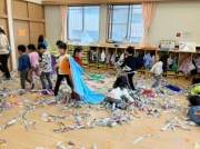 新聞紙・布の部屋では、紙が部屋いっぱいに広がっている様子に「うわー♪」と声をあげてスライディングしたり、両手いっぱいに紙を持って降らせてみんなで笑い合う姿が見られました。