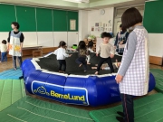 大型トランポリンを目にした地域の子ども達は「わあ」と目を輝かせ、躊躇することなくトランポリンに登り、横になってゆらゆら揺れる感覚を楽しみました。ジャンプをしたり、慣れてくると走ってみたり。寝転んだり仰向けの姿勢も面白く色々な体勢になりながら楽しむ子ども達もいました。