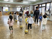 今日をとっても楽しみにしていた子ども達。コーチ達の姿が見えると「こんにちは〜!」と元気いっぱい挨拶をして、お楽しみのサッカー教室の始まりです。幼児3クラスが参加し、年齢に合わせて楽しさを感じられるような教室を開催していただきました。コーチとの勝負やミニゲームは白熱し応援の声も大きくなり、子ども達の笑顔が弾けていました。
