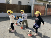 朝から「たのしみだね〜」「どんなひとがくるんだろう?」とわくわくしながら待っている子ども達!園庭でサッカー教室が始まると、よくコーチの話を聞きながら、ボールに片足を乗せてバランスをとったり、ボールを蹴りながらコーンの周りを走りゴールに向けて蹴ったりしながら楽しみました。「うまいね〜!じょうずになってきたよ!」と言われると少し照れながら嬉しそうにする子どもたちや「むずかしい〜」と言っている子もいましたが優しいコーチ達が楽しく教えてくれたのでみんなで一緒に参加することができました。