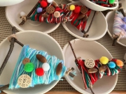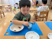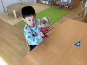 実際に散歩に行き、木の枝を子ども達と拾ってそれを保育士が三角の形にして、子ども達が自分の好きな色の毛糸を選んでぐるぐる巻きました。うまく巻いている子もいれば、同じところに何度も巻いてしまい「毛糸が無くなっちゃった〜!」と言いながら「あれ?」としている子…(笑)毛糸を増やしたり、同じところじゃなくて段々ずらしていくことを伝えるとまた一生懸命巻いて自分の木を毛糸でいっぱいにしていました。飾りつけは自分達で拾ってきたどんぐりとポンポン、木のボタンをボンドで付けてかわいいオーナメントができあがりました。
