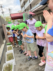 - 毎年、年長児クラスが行なっているお米作りを今年も始めました。「去年のうちゅう組さんがお米を作って食べていたよね」と嬉しそうにしていた子どもたち。稲の図鑑を見ながらお米の育て方みんなで調べ、心待ちにしていました。