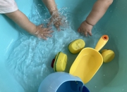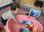 - 暑い日が続いていますが、あおぞら組では初めての水遊びを保育士と一緒に楽しんでいます。タライの中に手を入れて水をかき混ぜたり、水面を叩いたりして顔に水しぶきがかかると、笑い声をあげたり、繰り返し水面を叩いて水がかかる事を楽しみながら遊んでいます。