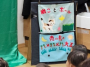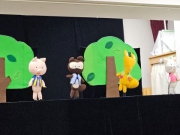 - 今年度も「人形劇団 どんぐり」さんが来てくださいました。いつも幼児が過ごしている部屋に大きな舞台が出来て始まる前から楽しみにしている子ども達。「ねことボール」のお話からスタートし出てくる人形を指差ししたり、子ども達の笑い声がすぐに聞こえてきました。「こぶたぬきつねこ」では手作りの折り紙の指人形を付けて一緒に歌をうたったり、人形劇では動物の体が次々と入れ替わっていき変化を楽しみ、「南の島のカメハメハ大王」では手作りのマラカスを振って全身でリズムを取って盛り上がっていました。人形をじっと見つめたり、想像したりと年齢ごとにそれぞれの楽しみ方で夢中になる姿が見られました。