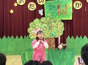 つき組は感染症の為、休みの子もいる中緊張する姿も見られましたが、期待に胸を膨らませる子ども達。友達の分も頑張るぞと、歌「にじのむこうに」「Fruit Song」「The Bus」、表現遊び「ともだちほしいなおおかみくん」を披露しました。劇遊びでは緊張で声が小さくなる様子もありましたが、1人ずつセリフを言っていき自信をもって取り組んでいました。