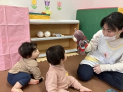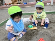 - 入園して1ヵ月が経ちました。少しずつ保育士に慣れ、安心して過ごせるようになってきました。室内では、ハイハイやつかまり立ちで行きたい場所へ向かい、気になる玩具に手を伸ばして遊ぶ姿が見られます。触れ合い遊びでは、保育士とのやり取りを楽しみ、笑顔を見せてくれることも増えました。園庭では、砂を握ったり型はめをしたりしながら、砂の感触や形の変化を楽しんでいます。周りの人や物にも興味を示し、視線を向けたり、じっと観察したりする姿も見られます。これからも安心できる環境の中で、楽しく過ごせるようにしていきたいと思います。