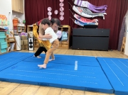 5歳児クラスは、これまでの経験を力に変えて、一人一人が真剣な表情で金太郎に挑みました。ついに勝つことができると、歓声とともに大喜び!達成感あふれる笑顔が広がっていました。