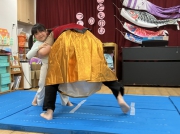 由来を知ったあとは、「これからも元気に過ごせますように」という願いを込めて、金太郎との相撲に挑戦しました。