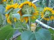 【ひまわりは、日の出前に東を向いて、太陽が上がり始めると光の方向に合わせて東から西に向きを変え、そして夜の間にその向きを西から東に変えて日の出を待つそうです。この動きをするのは成長過程の時期であり花を咲かせると、東に向きを固定してほとんど動かないそうです 】 立派な幹に登ってみました。小さなおじさんより (‘ω’)ノ