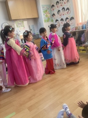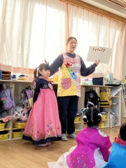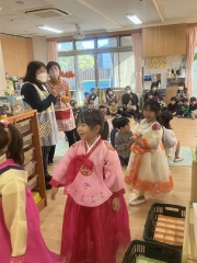 - 今日は多文化の日ということで、韓国朝鮮半島の民族衣装、チョゴリを着たうちゅうぐみさんが音楽に合わせてファッションショー風に登場!素敵な衣装にみんなも目をキラキラさせていました!