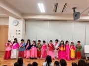 年長クラスのうちゅう組さんは、韓国の伝統衣装であるチョゴリを着てファッションショーのように歩きました。見ていたお友だちからは「かわいい〜!」と歓声があがっていました。うちゅう組さんはきりっとした表情で緊張しながらも堂々と歩いていました。